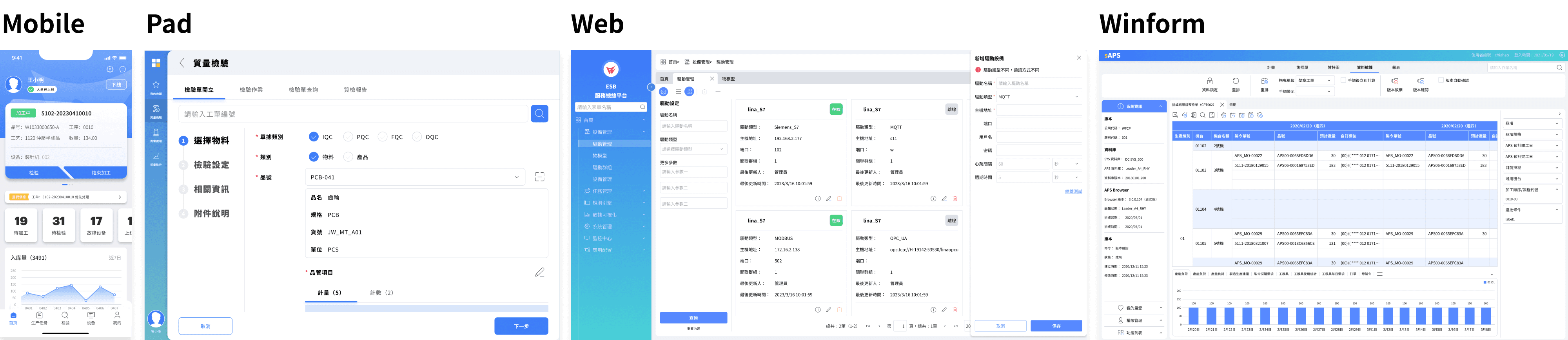 專注於公司的最高戰略目標,我們基於克隆家庭式的設計系統建立統一的品牌,統合各部門的產品,並分為Mobile、Pad、Web 和 Winform 四大平台,確保風格的統一性與適應性。最終,我們著眼於深化各裝置的應用,透過直觀的介面和清晰的信息結構,串接不同場景,構建車間的數位生態系統,提升整體工作流程的效率和一致性。