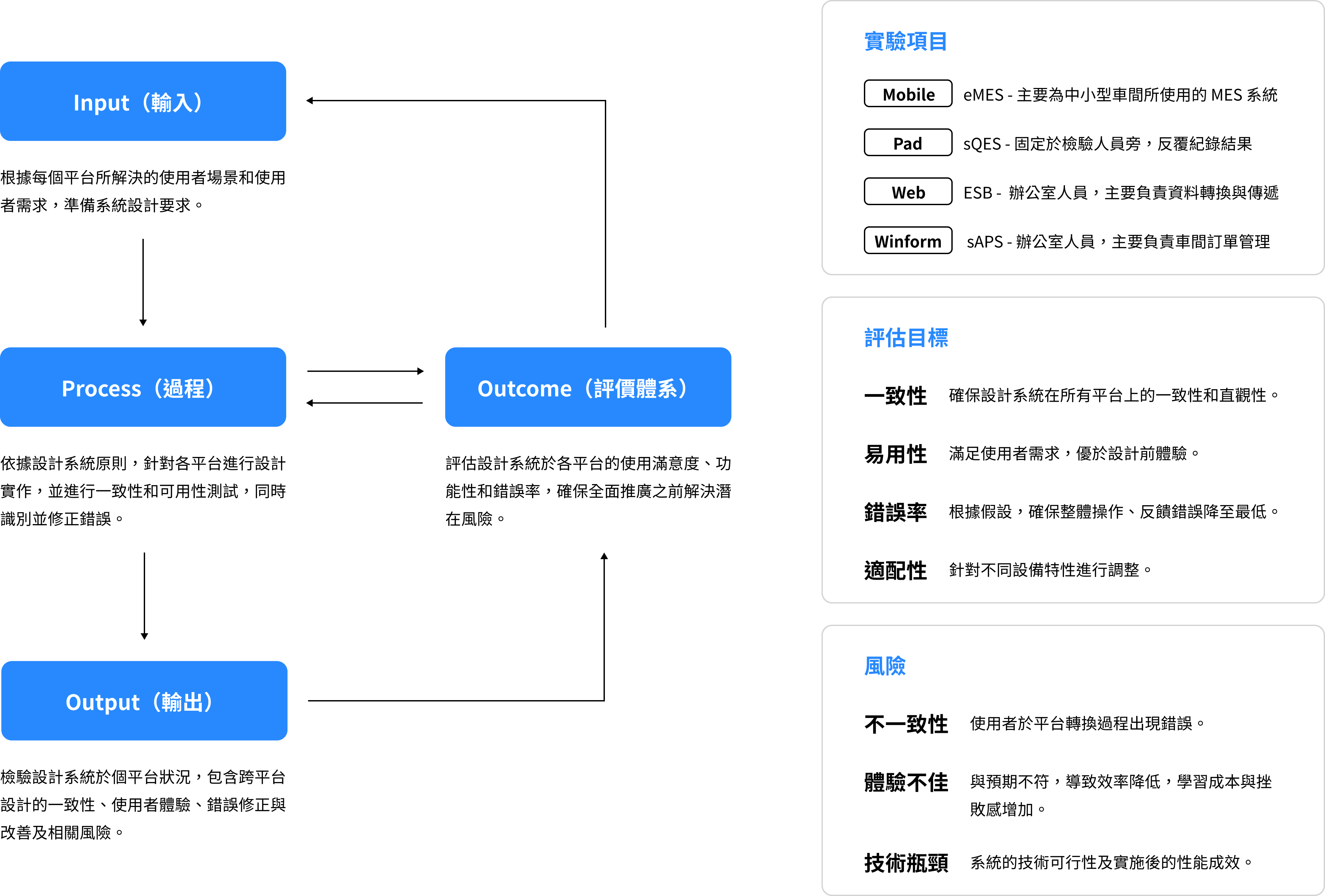 在過往的開發經驗中,我們了解到,無論調研和設計有多縝密,仍有很多因素可能影響設計的最終落地。為了確保此次設計如期達成,我們制定了設計系統,並優化現有產品。透過這一系統和優化後的布達流程,我們能夠更快地整合產品,並迅速驗證使用者體驗與市場適配,最終提升車間生態系的效率。