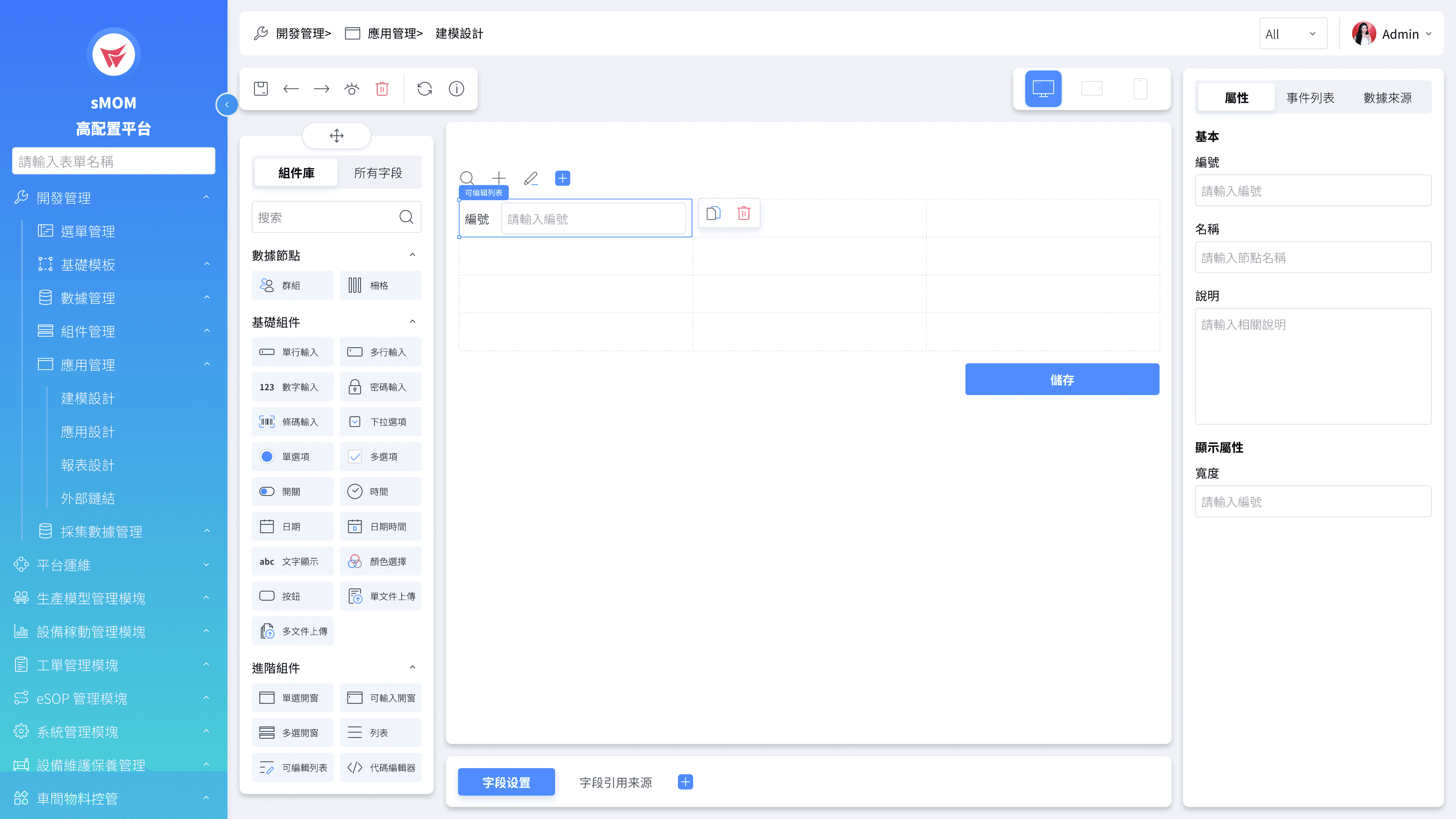 我們將資料、流程和頁面等項目做區分,使用者能夠在不同模塊下,快速建立系統功能已滿足使用者場景。