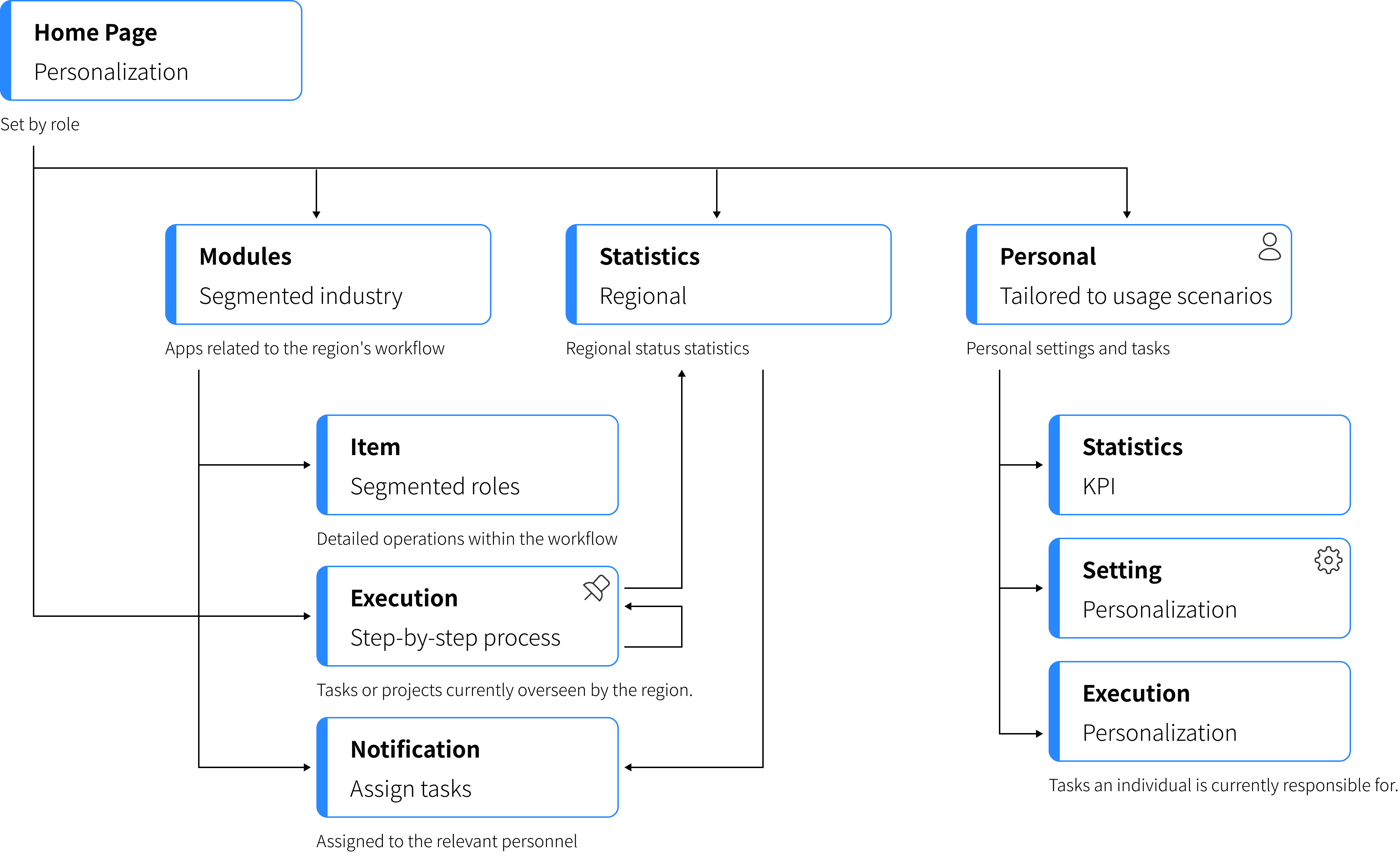 透過調研,我們整理出開發流程中,四個角色(使用者)的痛點和需求。我們也從之前的使用者訪談中了解到,各部門的使用者開發流程與習慣不同,且負責的產品面臨不同產業、規模、地區和業務場景,因此每個使用者的需求各異。這也是我們花較多時間在整理需求間的依賴關係,並透過模組化解決方案滿足不同的需求。