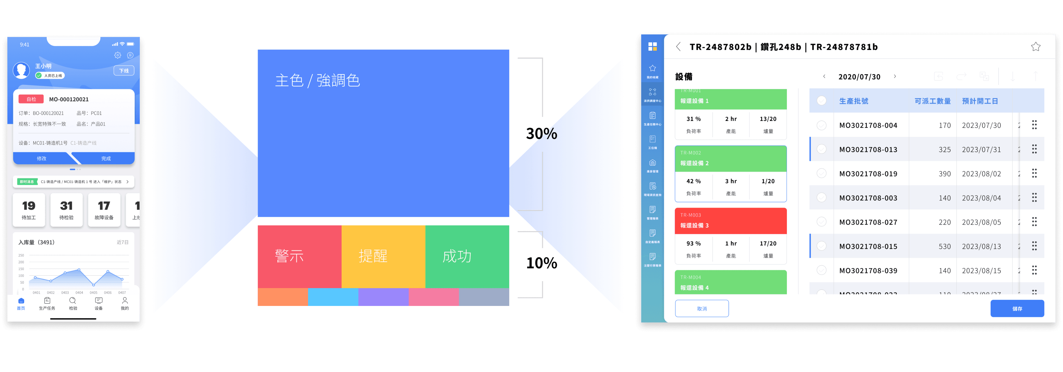 系統中的狀態色與強調色對於車間人員的效率有著直接的影響。同時,針對鼎華希望迅速覆蓋市場並成為領導者的目標,我們使用 30% 的品牌色和 10% 的強調色,不僅強化品牌辨識度,也提升用戶操作效率,達到市場推廣與流程效能的雙贏。