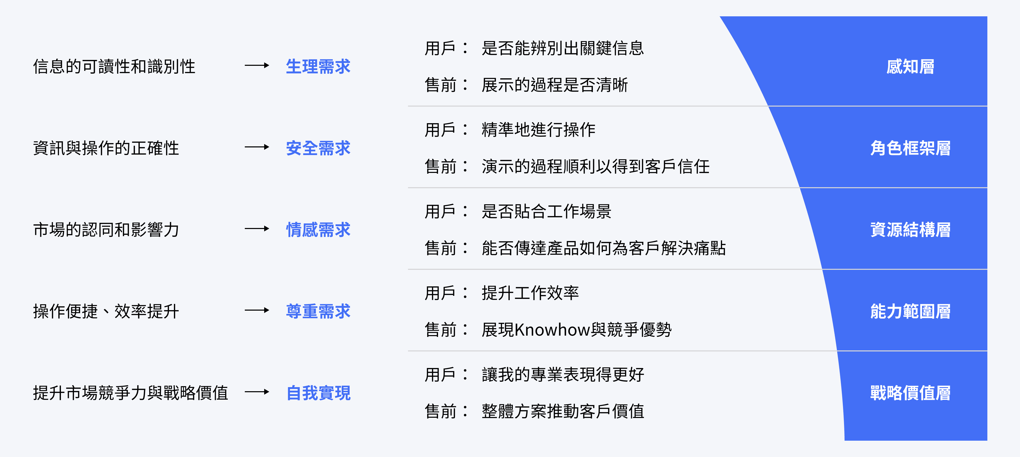 製造業客戶購買系統軟件的目的,是為了降本提效。我們想要確保使者的反應效率是快速且準確的,而7 ± 2 法則 (Miller’s Law)能夠實現我們記憶,並透過馬斯洛需求層次理論 (Maslow's Hierarchy of Needs)實現我們在緊急狀況於反饋行為。